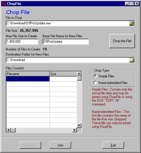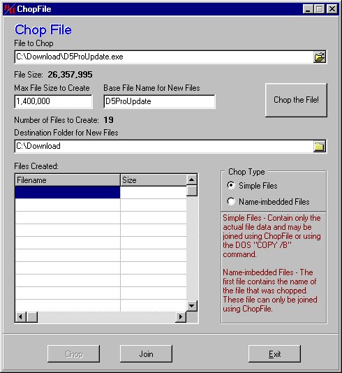 ChopFile will split a large file into smaller files that can then be copied to floppy disks, zip disks, etc. ChopFile will also join the smaller files to recreate the original file. ChopFile can create two types of smaller files - "Simple Files" and "Name-imbedded Files." The "Simple Files" contain only the exact contents of the original file, broken up into smaller chunks. These simple files can be joined using ChopFile -or- they can be joined using the DOS "Copy /B" command. Here's how...let's say that you chopped the file "BigZip.zip" into the smaller files "BigZip-001.ch1," "BigZip-002.ch1," and "BigZip-003.ch1." If you open a MS/DOS window and get a directory listing (DIR) you'll see these files listed as "bigzip~1.ch1, "bigzip~2.ch1," and "bigzip~3.ch1." In order to recreate the original file, just issue this command at the DOS prompt: copy /b bigzip~1.ch1+bigzip~2.ch1+bigzip~3.ch1 bigzip.zip The "/b" option indicates a "binary copy" meaning that each binary bit of the files will be copied. The "+" (plus sign) indicates that the files are to be copied one after the other, all of them to be combined in the output file "bigzip.zip." ChopFile also can create "Name-imbedded Files." The first file (of the several smaller files) will have the original filename imbedded within it, so you don't have to remember the original name of the file. These "Name-imbedded Files" can only be joined using ChopFile since the filename info must be stripped before combining the smaller files to recreate the original file. ChopFile ver 1.01 (this version) works in the most basic cases. You CANNOT split a large file directly to multiple floppy disks using this version...you must split to a drive (hard disk or zip disk) that can hold ALL the smaller files then copy them one-by-one to floppy disks if that's where you want them. If you attempt to copy directly to multiple floppies, ChopFile will start to copy then crash with an error when the floppy disk fills up. So don't do that. Future versions of ChopFile will be able to copy directly to multiple floppy disks, might verify chunks after creation, might even produce a "self-contained" file as the first file of the set that contains the joining program right in the file...we'll see where it goes from here. ChopFile is in a "beta" release. Currently there is no help available. The program has been tested and is solid and bug-free, but I will not release it as shareware until I have completed the help system. You are welcome to download the beta version of ChopFIle.