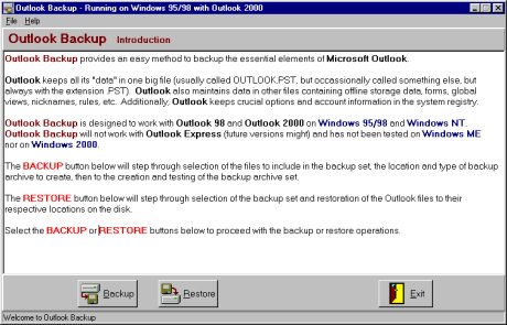 ****************************************** Outlook Backup enables you to backup all information stored by Microsoft Outlook. This includes all .PST file (which contain all the mail messages, address book entries, etc), signature files, templates, and the registry information containing you user options and mail accounts. Outlook Backup is designed to work with Outlook 98 and Outlook 2000 on Windows 95/98 and Windows NT. Outlook Backup will not work with Outlook Express (future versions might) and has not been tested on Windows ME nor on Windows 2000. Although there is no help system available yet, each screen of the program describes the actions you must take to use Outlook Backup. Download the Outlook Backup setup file (OBSetup.exe) and execute it to install Outlook Backup. The setup file will copy OutlookBackup.exe to the directory you select (normally c:\Program Files\BC Universal\) and the files Zipdll.dll and Unzip.dll to the c:\Windows\System\ directory. No changes will be made to your system registry or win.ini or system.ini files. NOTE: When you run the setup file, only the "Typical" application will be functional. If you select "Compact" or "Custom" you will still install just the files mentioned above. Download the beta version of Outlook