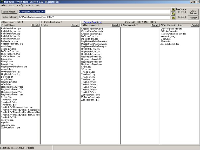 TwoDisks for Windows reads two different folders and compares them. It displays the results of the comparison in five different panes...those files only in "Folder 1", those files only in "Folder 2", those files that are in both folders that are NEWER in "Folder 1", NEWER in "Folder 2", and finally those that are identical in both folders. Click this link to discover some of the functions of the program. TwoDisks for Windows is in a "beta" release. Currently there is no help available. The program has been tested for over a year and is very solid and bug-free, but I will not release it as shareware until I have completed the help system. You are welcome to download the beta version of TwoDisks for Windows. Please remember that it is still a beta version without a help system. If you have comments, suggestions, recommendations, questions or complaints please . Download the beta version of TwoDisks.