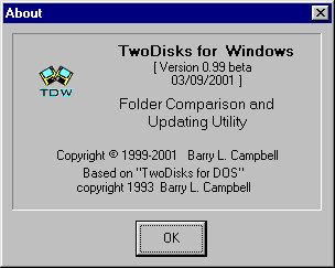 By pressing the "Details" or "D" buttons, you may see the file creation date/time and file size for each file in any category. For files in the first two categories ("Files Only in Folder 1" and "Files Only in Folder 2") you may COPY to the other folder, MOVE to the other folder, or DELETE from the existing folder. For files in the next two categories ("Files Newer in 1" and "Files Newer in 2") you may COPY the newer version to the other folder, MOVE the newer version to the other folder, or DELETE the older version from that folder. For files in the final category ("Files Identical in Both") you may DELETE from Folder 1, DELETE from Folder 2, or DELETE from both folders. You may select to delete by RECYCLING, DELETING from the disk (recoverable using an undelete utility), or WIPING (not recoverable by any utility!). For files in any of the last three categories (NEWER on one folder or the other and IDENTICAL on both) you may also perform a byte-for-byte comparison of the files. Click this link for TwoDisks FAQ (Frequently Asked Questions) |