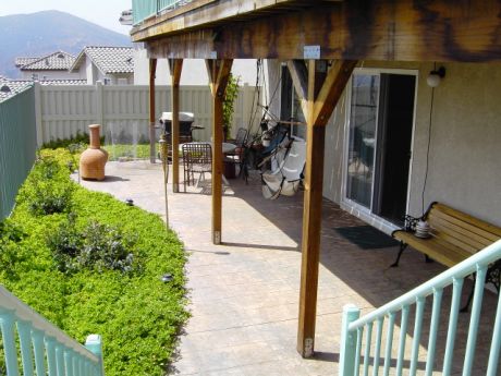 ![]() This is the patio area the back of the house, taken from the steps coming down from the hot-tub. The sliding doors go into the master bedroom suite. You can see our outdoor fireplace (chimanea, or something like that) and some of our garden at the far end of the patio. The climbing vine that is just visible at the other end of the padio is "hops" that I'm growing for my homebrewing. Click here for some pictures of the view from the back of my house... |