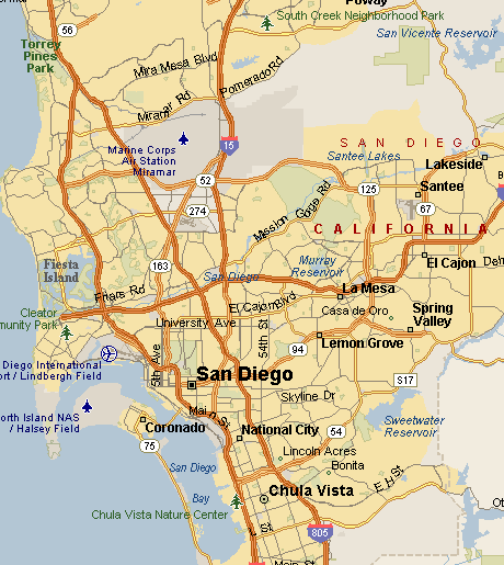 ![]() This is just PART of San Diego county. I live in Spring Valley "an unincorporated community of San Diego county" it says right on the sign! You can see Spring Valley on the right near the center of the map. Other communities include Lemon Grove, a very nice older community, La Mesa, El Cajon (pronounced "Ka-hone", one of those pesky spanish words that creep into southern California life). I work out on Point Loma, very near the word "Halsey" near the bottom left of the map. You can see Sweetwater Reservoir from my front door. Click here to zero in on Spring Valley... |